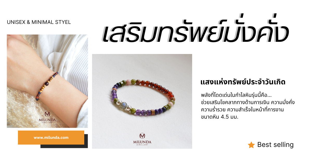 ที่มาของ “แสงแห่งทรัพย์ประจำวันเกิด” ที่เน้นเสริมโชคลาภเงินทองโดยเฉพาะโดยการใช้ศาสตร์แห่งสีมงคลประจำวันเกิด ที่เสริมด้าน “มูละ” เป็นหลัก และเสริมด้วยหินเกี่ยวกับการงานและความสำเร็จ ที่เป็นเหตุนำพาทรัพย์สินเงินทองให้หลั่งไหลเข้ามาสู่ชีวิต ไม่ว่าจะเป็นหินที่เสริมสมาธิ เสริมพลังโฟกัสสู่เป้าหมาย เสริมพลังแห่งสติปัญญา เสริมพลังชีวิต เสริมจิตวิญญาณให้แข็งแกร่งเพื่อดึงดูดโอกาสดีๆ ให้เข้ามาสู่ชีวิต นี่จึงเป็นกำไลหินมงคลรุ่นที่ขายดีที่สุด และมีลูกค้ากลับมารีวิวให้มากที่สุด…