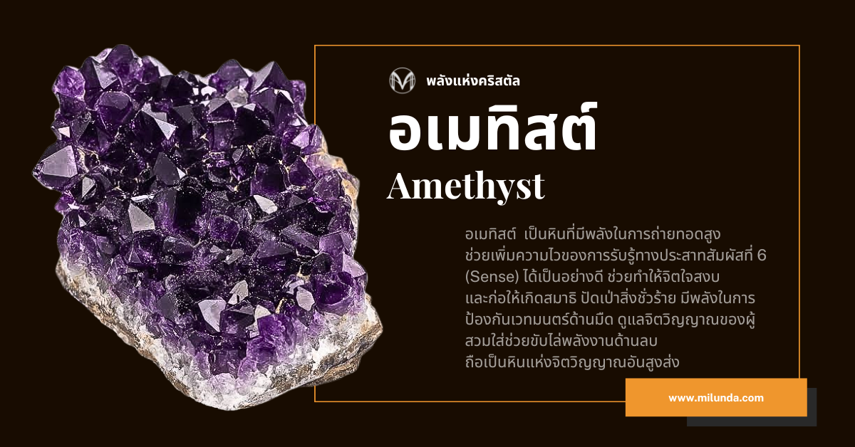 อเมทิสต์ ให้ความรู้สึกลึกลับ เคร่งขรึม มีอำนาจ และสง่างาม ช่วยเสริมบารมีและนำโชคลาภมาสู่ผู้ครอบครอง ในยุคโบราณอเมทิสต์ถูกใช้เป็นเครื่องประดับของพระมหากษัตริย์ตั้งแต่สมัยของฟาโรห์ในอียิปต์โบราณ เป็นสัญลักษณ์ของความมั่นคงทางจิตใจ ช่วยให้บังเกิดความยุติธรรมขึ้นภายในจิตใจ ช่วยสยบอารมณ์โกรธ โมโหร้ายบำบัดความเครียด ลดความวิตกกังวล บำบัดรักษาอาการนอนไม่หลับ ลดความฟุ้งซ่าน ช่วยให้เข้าสู่สมาธิได้ดียิ่งขึ้น…